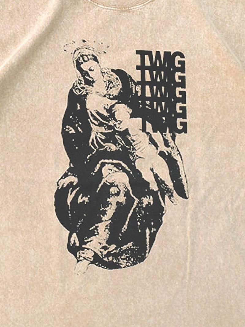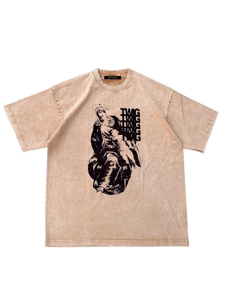 マリアプリントのリラックスウォッシュTシャツ。 背中オリジナルパッチデザイン。 material:cotton100% サイズ1:肩幅約57cm身幅約60cm袖丈約22cm着丈約74cm サイズ2:肩幅約61cm身幅約64cm袖丈約24cm着丈約78cm 寸法はおおよそとなります、ご了承ください。 ※画像はサンプルです。実際の商品と仕様や色味など若干変更になる可能性がございます、ご了承ください。